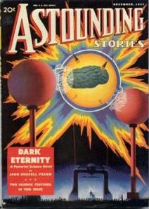 This is the cover from Astounding September 1937. It depicts the Brittania blasting a Boskonian commerce raider with her Q-Gun. Art by H. W. Wesso.
