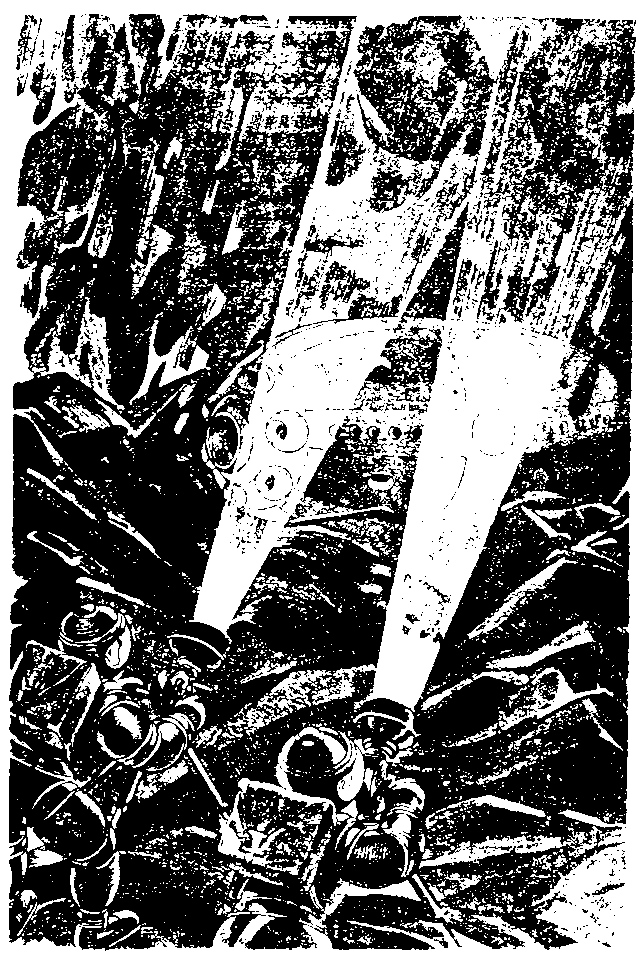 An interior illustration from Astounding September 1937. It depicts Kinnison and van Buskirk burying the Brittania's lifeboat. Art by Hans Waldemar "Wesso" Wessolowski.