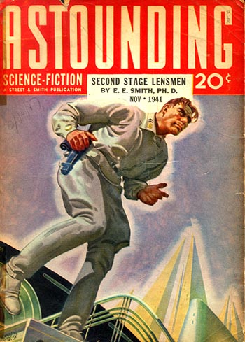 This is the cover from Astounding November 1941. Kinnison's unlimbering his DeLameter. Art by Hubert Rogers.