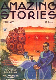 Amazing Stories February 1934. The cover has nothing to do with Triplanetary, but is included here for reference. Art by Leo Morey.
