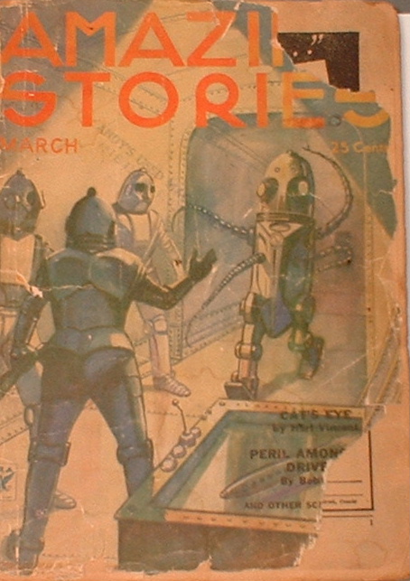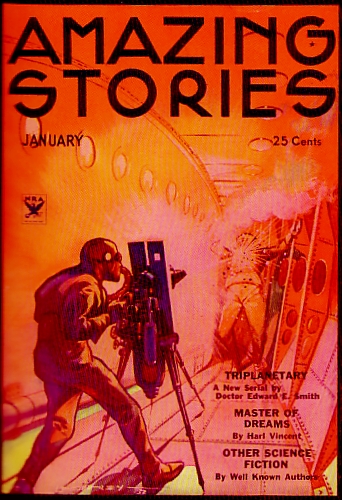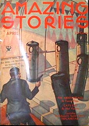 Amazing Stories April 1934. The cover has nothing to do with Triplanetary, but is included here for reference. Art by Leo Morey.