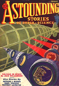This is the cover from the March 1933 issue of Astounding where "Triplanetary Part 1" was originally slated to appear. Due to a change of editorships, the story was not carried, but this piece of art, depicting Conway, Clio and Bradley escaping from the Hyperion in a life boat, was retained.