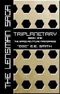 The iBooks mass market edition of Triplanetary. This appears to be a preliminary mock-up, as there is a retro-styled spaceship visible through the hexagons on the actual book.